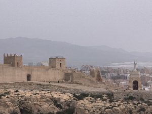 Callejeamos hasta la plaza de la Catedral, un edificio impresionante ejemplo de iglesia-fortaleza, la plaza ha sido remodelada, allí encontraremos el obispado en un edificio enfrente de la catedral y el hotel Catedral. Seguiremos hacía el norte para llegar a la Plaza Vieja, donde se encuentra el ayuntamiento, en el centro encontramos un monolito que es el Monumento a los Coloraos, militares liberales que desembarcaron en Almería huyendo… desde aquí podemos ver la muralla de la Alcazaba y el Cristo del Cerro de San Cristóbal. Este castillo de origen musulmán domina toda la ciudad y el puerto, las vistas desde sus torres y murallas son impresionante, y allí es donde podemos disfrutar de la luminosidad de esta tierra llamada “Espejo del Mar”. Recomiendo visitar este gran monumento.