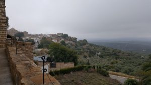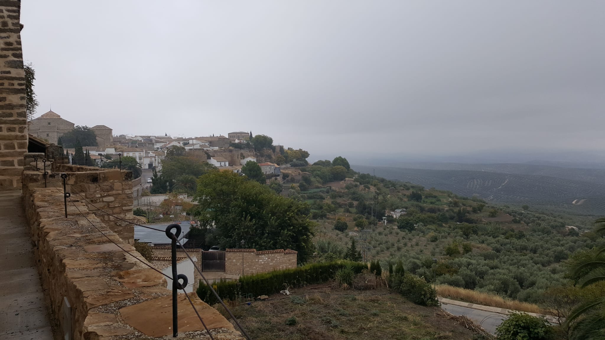 Si miramos hacia el oeste podemos distinguir las murallas del Castillo de Santa Catalina, que dominan la ciudad y ofrecen unas amplias vistas de la ciudad y del olivar que la rodea.