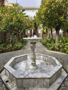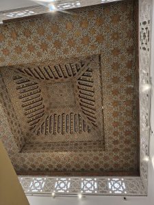 - Museo de la Confluencia (Dar el Bacha). Para llegar a este palacio hay que caminar también a través de los zocos hacia el oeste, aquí parece que las calles son más amplias, es una zona más moderna. Aún se notan las consecuencias del terremoto de hace dos años, con edificios apuntalados. Este museo se encuentra sobre un palacio, muy bien conservado. Todo está alrededor de un patio rectangular, o mejor dicho jardín, con una fuente de agua en el centro, distintas puertas en cada uno de los lados que dan a las distintas estancias donde se encuentran las exposiciones de restos arqueológicos, documentos, herramientas, armas,…. Hay que quitarse el sombrero en cada estancia cuando miras al techo porque el artesonado es espectacular, nos recuerda a la Alhambra de Granada aunque salvando las diferencias. En este palacio hay también una exposición de café, puedes degustar múltiples variedades e incluso comprar, de hecho hay una entrada libre hasta la tienda de cafés con un horario determinado. A pesar de ser el mes de febrero había gran cantidad de turistas, de todas las nacionalidades y cosa curiosa muchos parecían de alta capacidad económica, lo que no habiamos encontrado en las anteriores visitas. Para entrar hay que pagar seis euros.