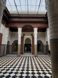 - Museo de Marrakech. Se encuentra al lado de la madraza y según la publicidad en el se puede seguir la historia de la ciudad; sin embargo, lo que encontramos son exposiciones de pintores locales. El edificio no está tan bien conservado como la madraza, hay humedades. A destacar el patio central con una lámpara enorme de metal y color marrón. La entrada también cuesta cinco euros, pero en mi opinión no merece la pena.