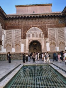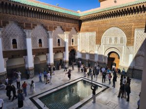 - La Madraza de Ben Youssef. Este antiguo colegio coránico, bien conservado, con un gran patio central con un estanque rodeado por las habitaciones de los estudiantes, que a su vez se ordenan alrededor de pequeños patios a los que dan las puertas y las pequeñas ventanas. El edificio no tiene ventanas que den a las calles. Es un tesoro de la arquitectura islámica en Marrakech. Fundada en el siglo XIV y reconstruida en el XVI por la dinastía saadí, destaca por su imponente fachada, adornada con detalles geométricos y arabescos que reflejan la maestría del arte islámico. La entrada cuesta 50 MAD, unos cinco euros.