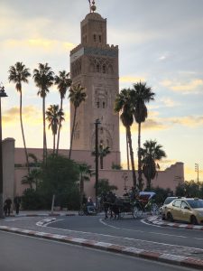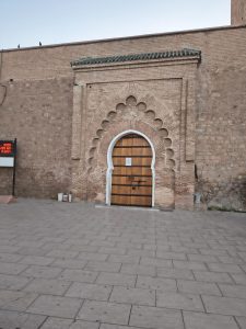 - Mezquita Kutubía. Es bastante fácil llegar a ella desde nos encontramos, la calle que seguimos hacia el sur permite la circulación de vehículos en los dos sentidos, con una acera a ambos lados, Aquí también encontramos establecimientos comerciales pero más amplios, más occidentales. Además el minarete de la mezquita es visible por lo que es difícil perderse. La mezquita no se puede visitar, tan solo se puede mirar a través de sus puertas los suelos cubiertos de alfombras y los fieles en oración. Al lado de la mezquita está el Parque Lalla Hasna y elCimetière Sidi Ali Bel Kacem.