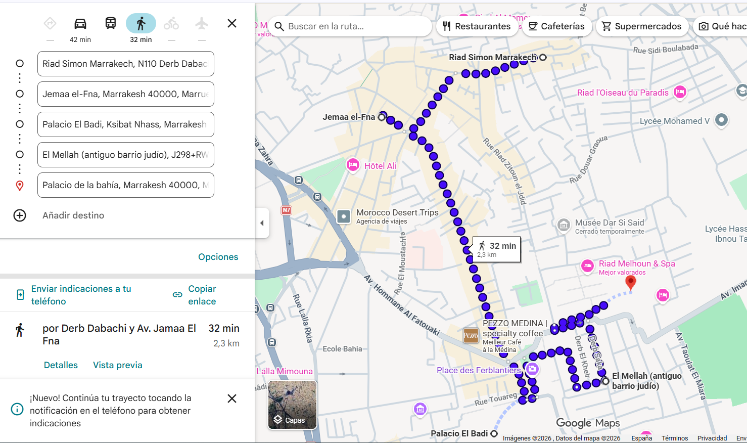 Salimos de nuestro Riad, nos dirigimos a la Jemaa y desde allí a través de los zocos y orientados con el móvil llegamos a la Madraza de Ben Yousseff. A penas hemos andado un kilómetro pero hemos tardado casi media hora porque las estrechas calles están abarrotadas de turistas y nativos.