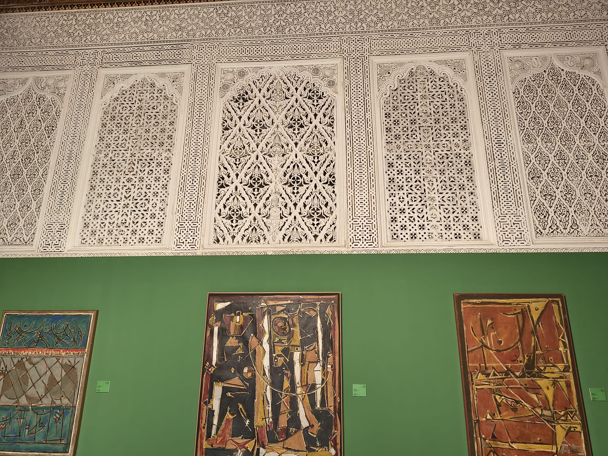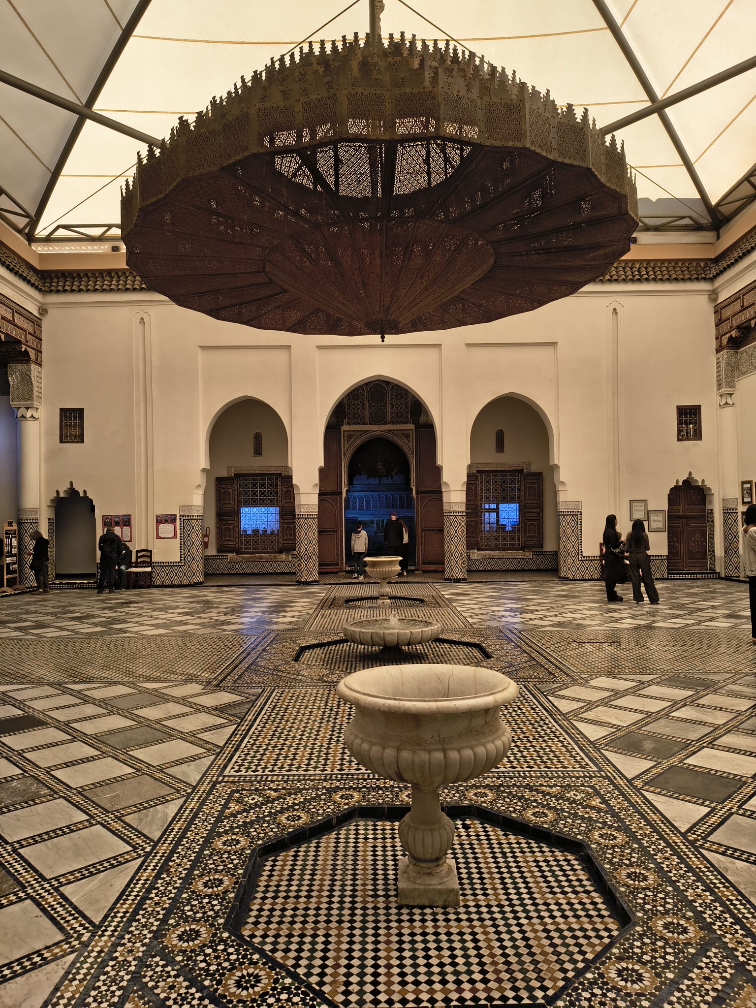 - Museo de Marrakech. Se encuentra al lado de la madraza y según la publicidad en el se puede seguir la historia de la ciudad; sin embargo, lo que encontramos son exposiciones de pintores locales. El edificio no está tan bien conservado como la madraza, hay humedades. A destacar el patio central con una lámpara enorme de metal y color marrón. La entrada también cuesta cinco euros, pero en mi opinión no merece la pena.