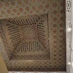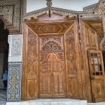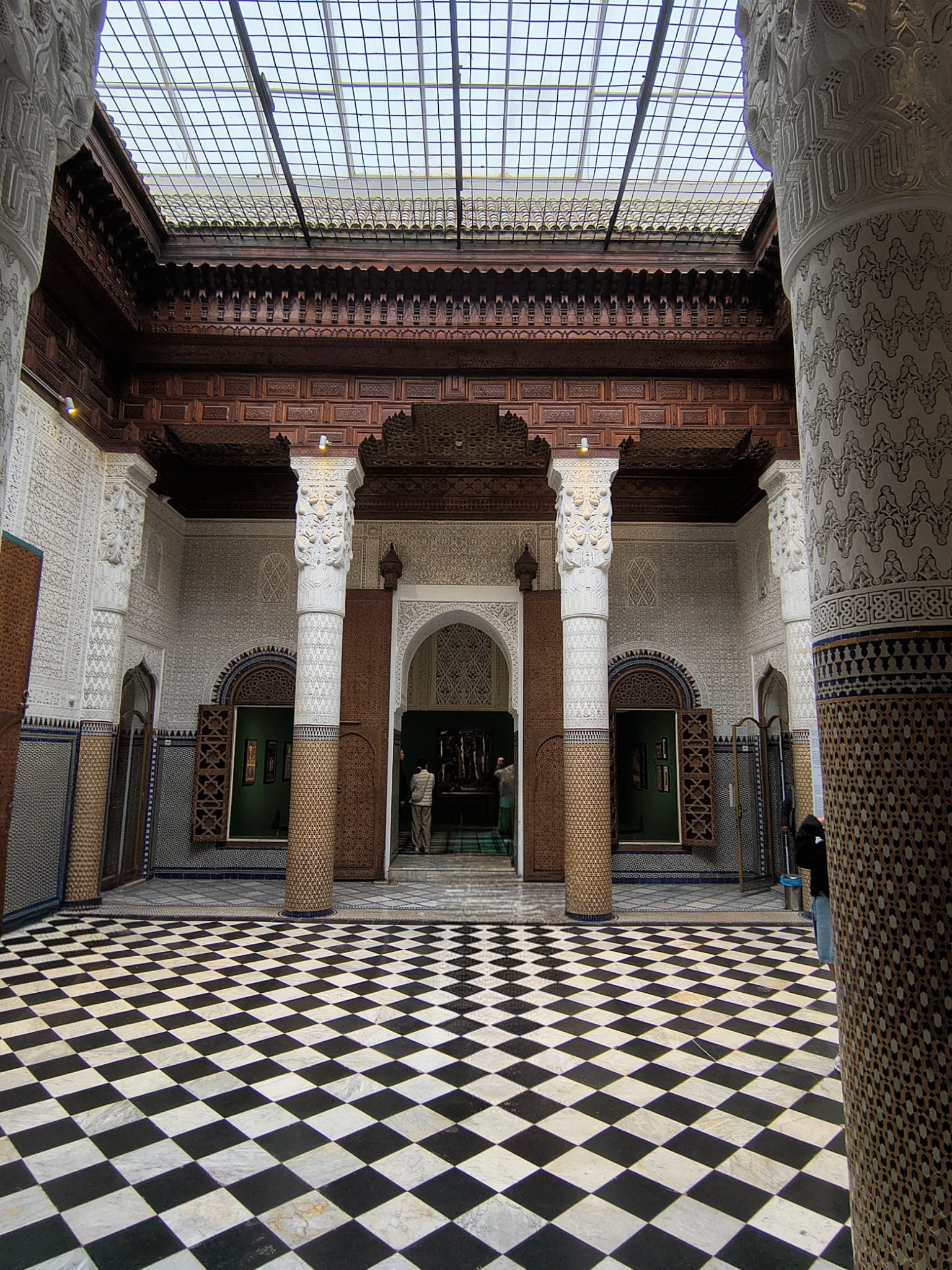 - Museo de la Confluencia (Dar el Bacha). Para llegar a este palacio hay que caminar también a través de los zocos hacia el oeste, aquí parece que las calles son más amplias, es una zona más moderna. Aún se notan las consecuencias del terremoto de hace dos años, con edificios apuntalados. Este museo se encuentra sobre un palacio, muy bien conservado. Todo está alrededor de un patio rectangular, o mejor dicho jardín, con una fuente de agua en el centro, distintas puertas en cada uno de los lados que dan a las distintas estancias donde se encuentran las exposiciones de restos arqueológicos, documentos, herramientas, armas,…. Hay que quitarse el sombrero en cada estancia cuando miras al techo porque el artesonado es espectacular, nos recuerda a la Alhambra de Granada aunque salvando las diferencias. En este palacio hay también una exposición de café, puedes degustar múltiples variedades e incluso comprar, de hecho hay una entrada libre hasta la tienda de cafés con un horario determinado. A pesar de ser el mes de febrero había gran cantidad de turistas, de todas las nacionalidades y cosa curiosa muchos parecían de alta capacidad económica, lo que no habiamos encontrado en las anteriores visitas. Para entrar hay que pagar seis euros.