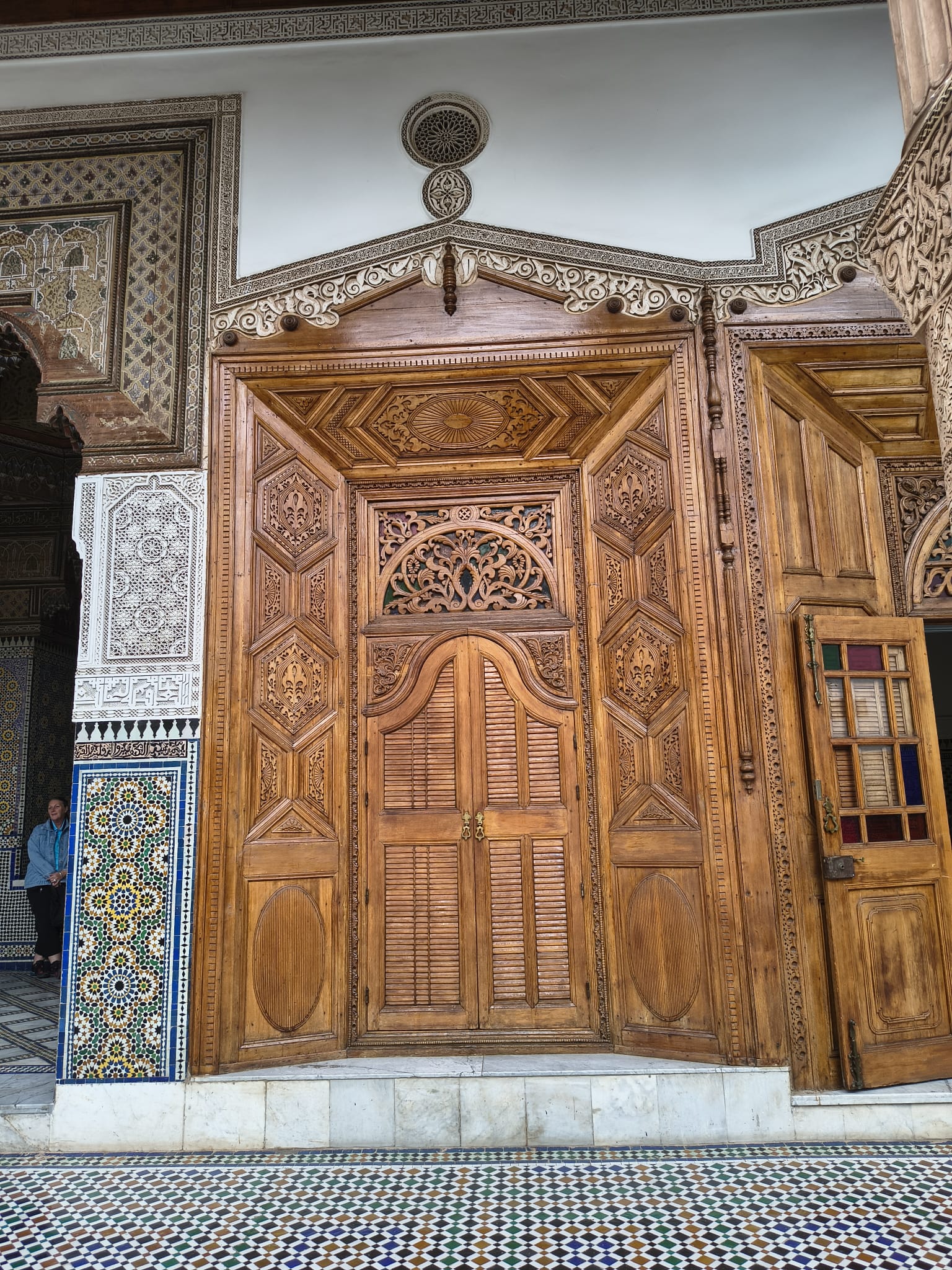 - La Madraza de Ben Youssef. Este antiguo colegio coránico, bien conservado, con un gran patio central con un estanque rodeado por las habitaciones de los estudiantes, que a su vez se ordenan alrededor de pequeños patios a los que dan las puertas y las pequeñas ventanas. El edificio no tiene ventanas que den a las calles. Es un tesoro de la arquitectura islámica en Marrakech. Fundada en el siglo XIV y reconstruida en el XVI por la dinastía saadí, destaca por su imponente fachada, adornada con detalles geométricos y arabescos que reflejan la maestría del arte islámico. La entrada cuesta 50 MAD, unos cinco euros.
